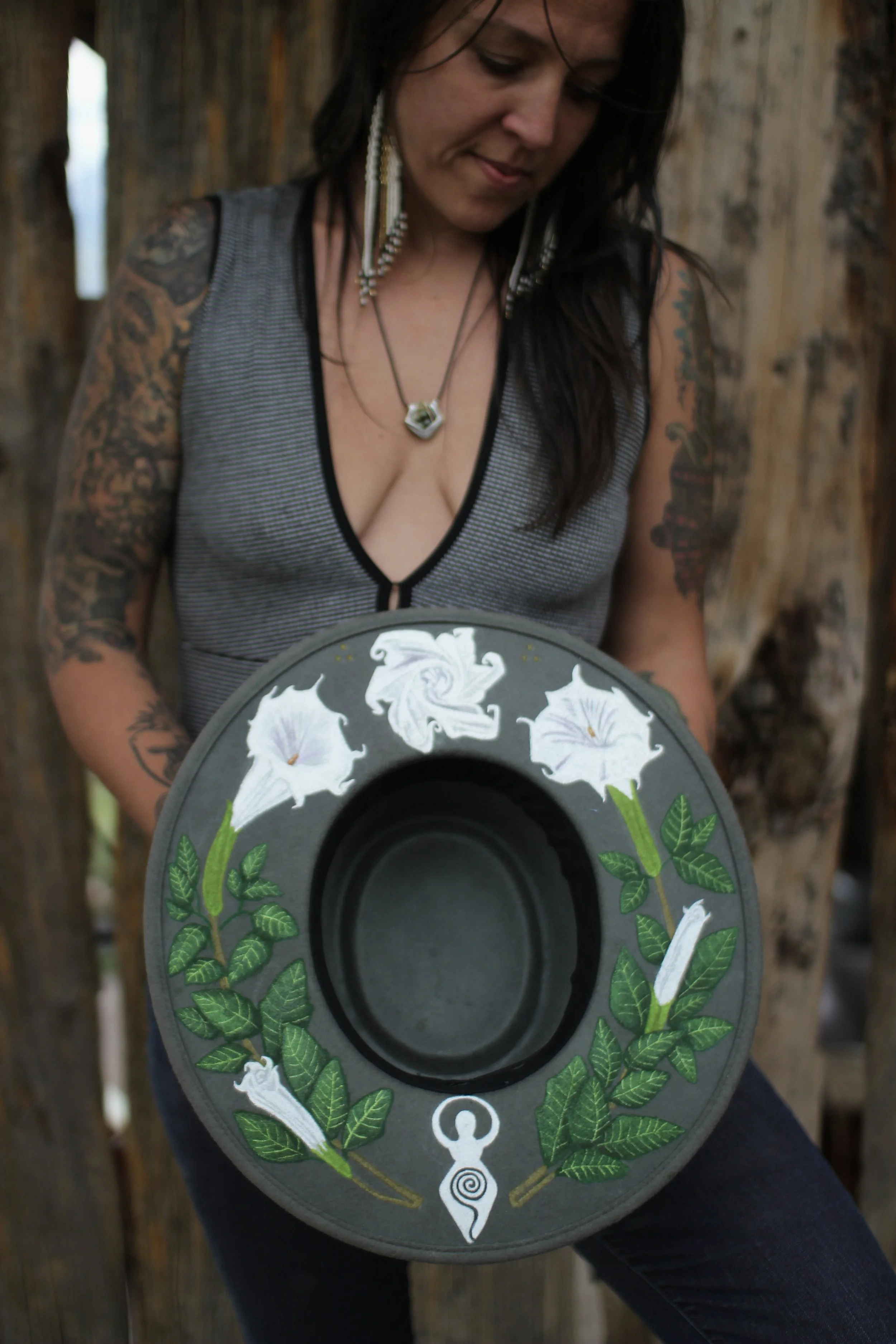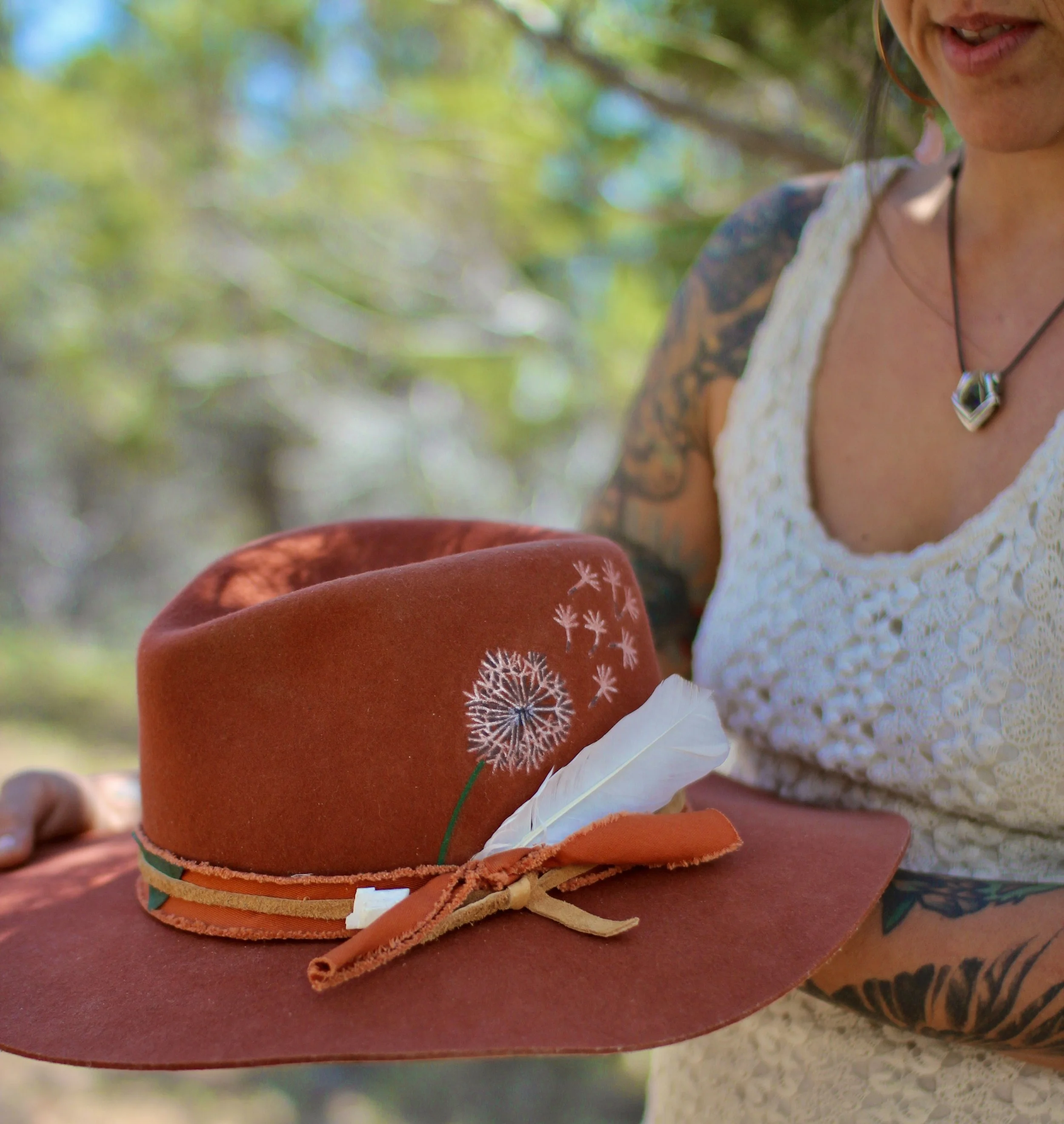 As we discover the design details and customizations that you desire, the price will reflect your choices. Design elements can be things like: Feathers, gemstones, a more complex hat band (braided, more than one band, silk, etc), distressing, extra painting (both sides of hat), dried flowers, a hat pin, and the list goes on.